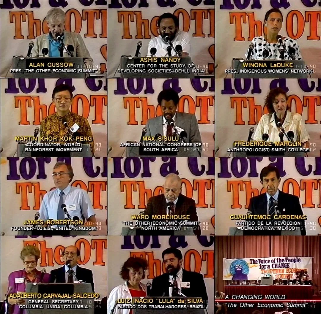 While the world's most prominent leaders gathered at Rice University and dined on tortilla soup at Bayou Bend mansion, on the other side of Houston at the modest Astro Village Hotel, a group of politicians, academics, activists, and populist leaders gathered at an alternative summit called The Other Economic Summit (TOES). The goal of TOES was to build an "international citizen coalition for new economics grounded in social and spiritual values to address concerns the G7 consistently neglects, such as poverty, environment, peace, health, safety, human rights, and democratic global governance."
